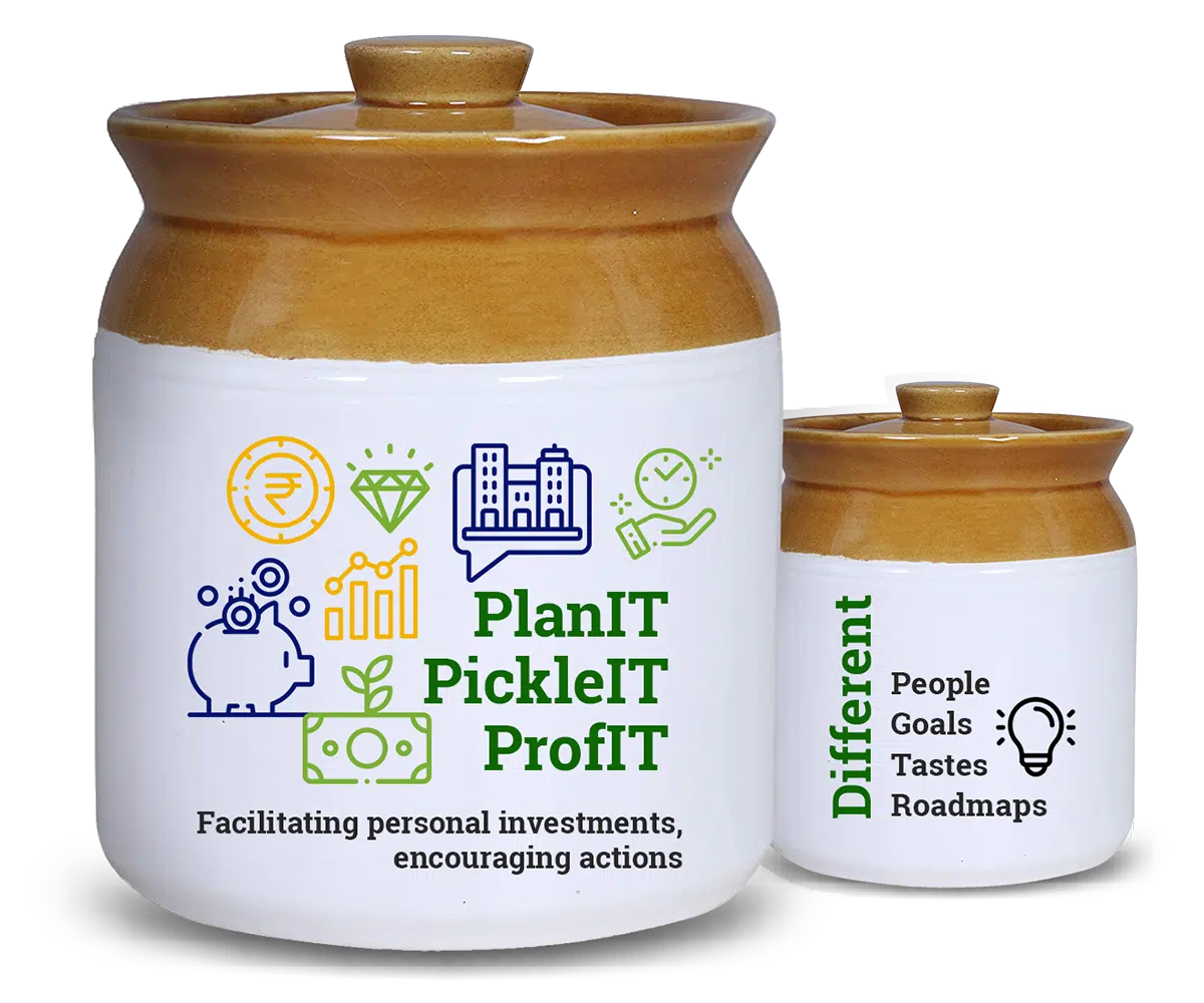 Great ideas take time. Similarly, pickles and investments both take time to soak and develop. Hence our brand, Pickle-Jar Investments, which shows our prudent approach to investments as a mutual fund distributor. It also envelopes the environment we want to inculcate in investors. That of patience, perseverance, and delayed but well-deserved gratifications.